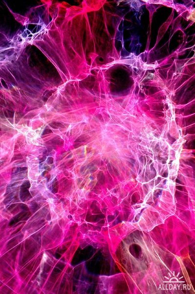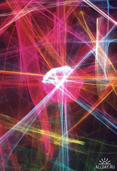 Как удалось уловить со слов автора, это - аналоговые изображения переломлений лучей света, проходящих сквозь различные прозрачные объекты. Картинка фиксируется непосредственно на 35мм пленку камерой без объектива: на его месте сам объект. Никакого фотошопа. Цвет добавляется непосредственно в материал