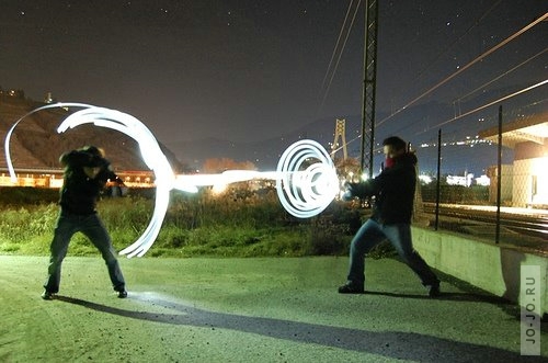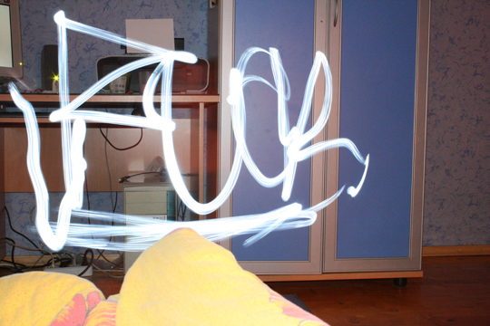 Объясняю - просим у папочки денег по максимуму и идем в мвидео, там покупаем фотик, у которого можно регулировать длину выдержки(как правило это на фотиках подороже). Я фоткала на максимальной - 30 секунд-и фонариком в обратном варианте в воздухе пишешь неприличное словечко, в итоге получается такая шняга) Оч забавно, что при этом меня в кадре не видно, потому что я все время бегала туда-сюда и фотик среагировал только на самые яркие объекты в кадре. Но есть еще некоторые способы, чтобы к примеру людей было видно - как на фотке. |